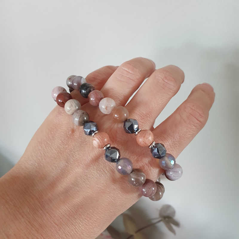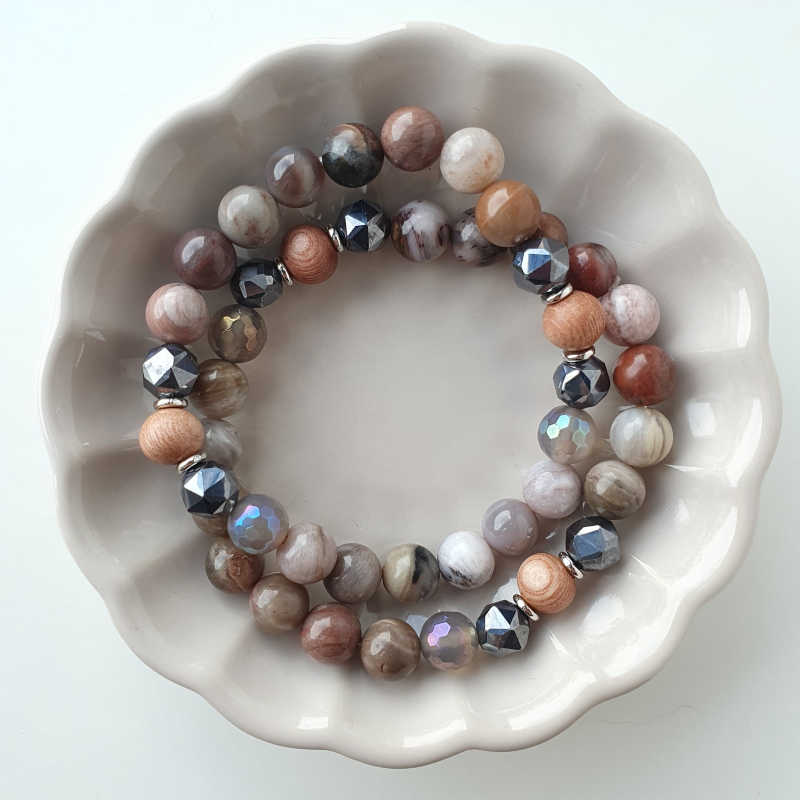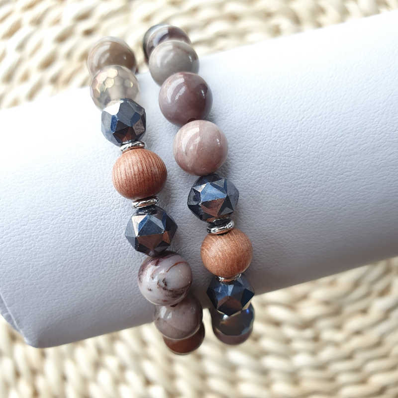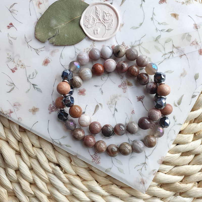 Bratara din agate, terrahertz, lemn si accesorii metalice argintii, pe fir elastic. Margelele din aceasta bratara aromaterapie masoara aproximativ 8 mm.